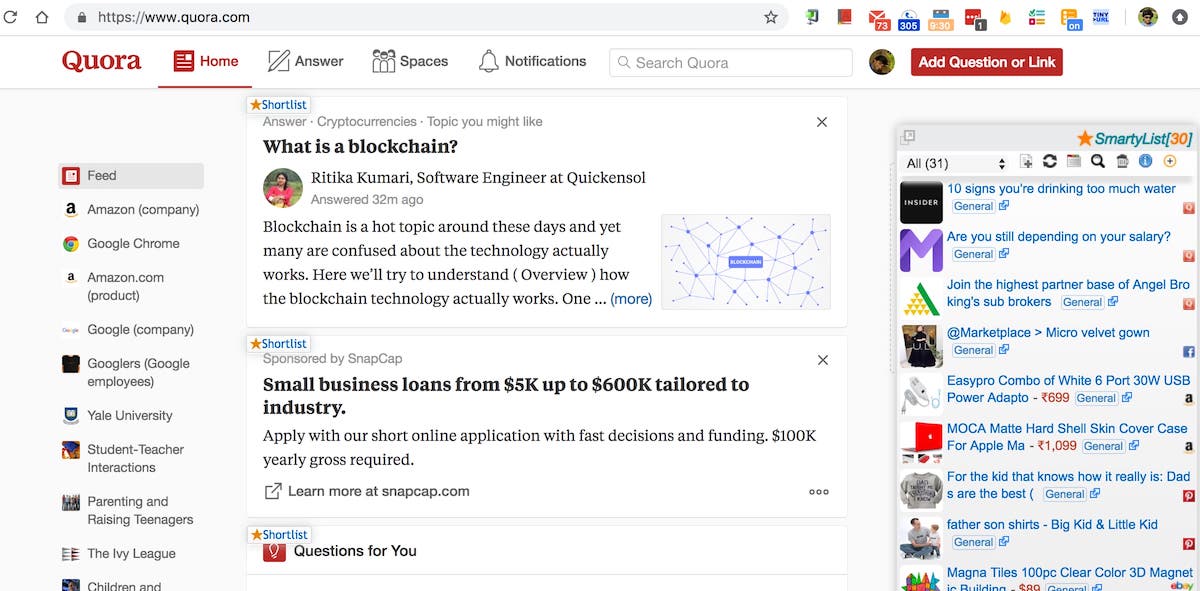 Quora homepage with questions