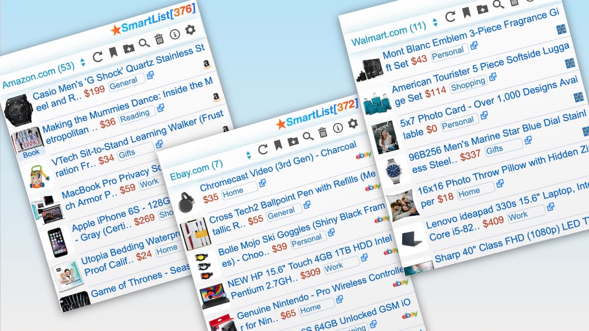 For example as shown above, with Amazon.com, Walmart.com or Ebay.com, an user can just be a buyer, seller, promoter, dealer, brand owner etc, and all of these users have common goal of saving any favorite product either to buy, review, share, or just save them for future. For instance, a person can Shortlist a list of groceries to buy, items to gift, and some Books to read later, and add Movies to Shortlist like a watch list. There are literally more than 100+ formats of each product being displaying on those sites, so SmartyList can easily detect all of them so users can quickly shortlist them. Now, whatever webpage or link you visit on those sites, you can shortlist any product in any format quickly. Say good bye to WishList.