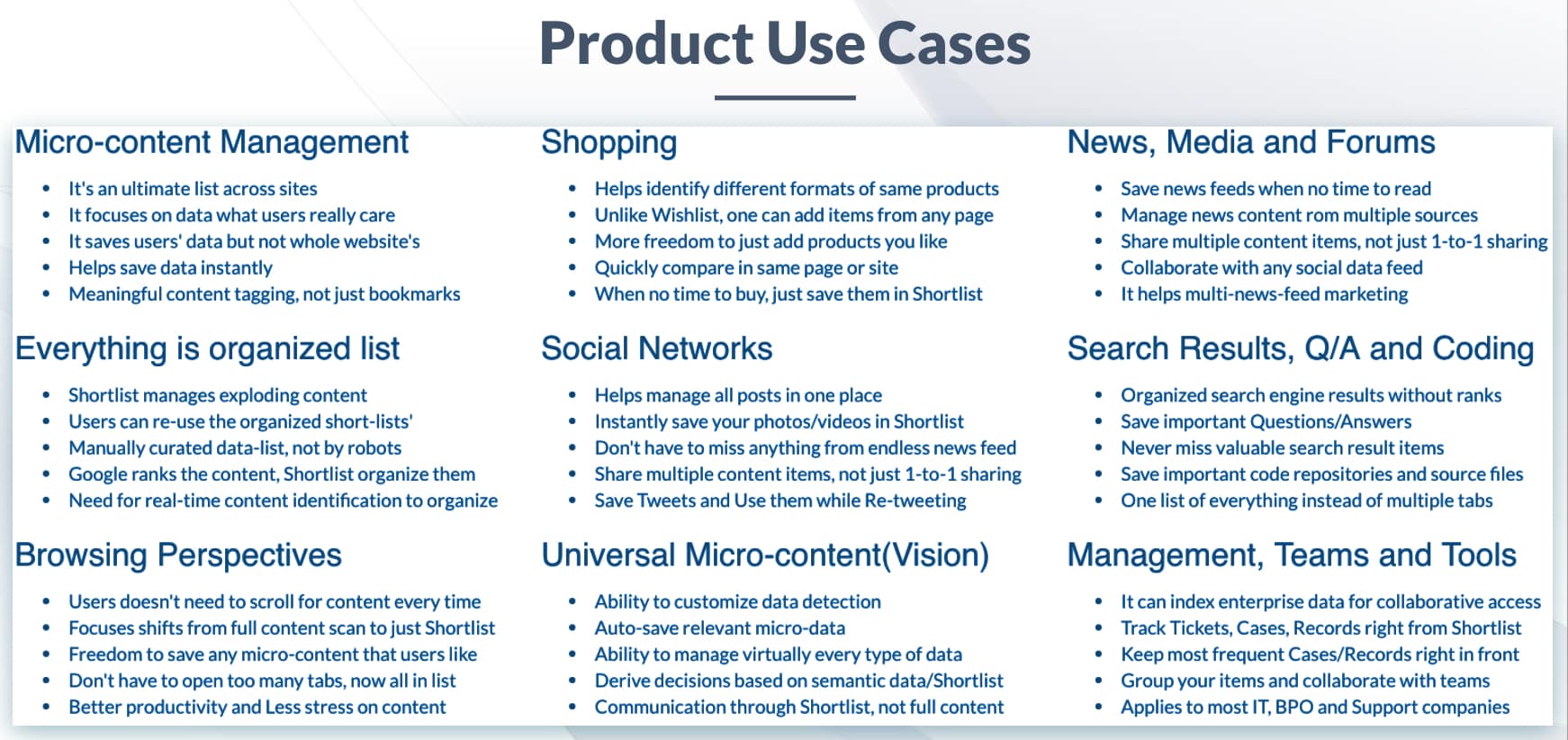 Whether the user is browsing Amazon, Facebook, Twitter, Instagram, Youtube, Flipkart or anything, the SmartyList helps them save any favorite information on the fly in one place as Shortlist and it is accessible on cross-domains in real-time. For example, a user can intuitively shortlist products, social feeds, tweets, photos, videos, news, questions, answers, jobs, user profiles, and even custom data, all in one place as Shortlist. These are for real world applications which will immensely help regular internet users, shoppers, journalists, students, employees, HRs, recruiters, business and media agents, and roughly the next billion users who are looking for smarter and efficient ways to consume the information and collaborate seamlessly.